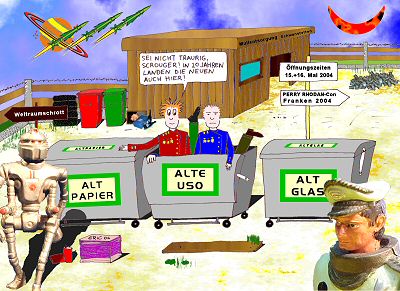 Auch im Händlerbereich begannen bereits die Aufbrucharbeiten und man konnte noch das eine oder das andere Schnäppchen erstehen, das die Händler nicht mehr einpacken wollten. Letzte Fotos wurden geschossen, bevor wir unseren Tisch räumten und zum Glück wenigsten hier weniger mitnehmen mußten als wir hergebracht hatten. Es wurden doch einige Fanzines verkauft, und das Infomaterial im Ständer war ebenfalls deutlich weniger geworden. Fast hätten wir die Plakate und Bilder an der Wand und eine Speisekarte vergessen, aber letztendlich hatten wir unsere Siebensachen beisammen. Mit im Gepäck war natürlich die Interessentenliste für den Zielstern-Con, auf der sich etliche Fans eingetragen hatten, aber auch in mehreren Gesprächen wurde angedeutet, daß großes Interesse an diesem Con bestehen würde. Nun ja, die Planungen sind im Gange, und es wird sich sicher für jeden deutschen Fan lohnen, eine Reise nach Wien zu unternehmen! 2004 - Wo, bitte, gehts hier nach Passau? Die letzten Einkäufe im Auto unterzubringen, war das reinste Kunststück, und daß wir selbst auch noch hineingepaßt hatten, das reinste Wunder. Aber wir waren sicher nicht die Einzigen, denen es so ergangen war, denn der einzige Bankomat in der Gegend spuckte zuletzt nur mehr 5-Euro-Scheine aus. Gegen halbzwölf Uhr ließen wir das Con-Gebäude hinter uns und traten die Heimreise an dachten wir zumindest. Auch für die Rückfahrt gab es wieder einen schönen Ausdruck aus map24.de, das ich zu Beginn so lobend erwähnt hatte. Wir fuhren also los und landeten auf einer der unzähligen Autobahnen, die es laut Plan gar nicht geben dürfte. Okay, also retour, Abfahrt runter, Abfahrt rauf, weiter geht es. Wir fuhren und fuhren, und waren plötzlich bei der Abfahrt Schwanstetten. Manfred verlor schon etwas die Nerven, als wir dann wieder in die Gegenrichtung fuhren und die Strassen nach wie vor ganz anders waren als auf unserem Plan. Ein paar Blumenpflückerinnen am Straßenrand brachten uns schließlich auf die richtige Fährte bzw. Straße und so waren wir in der glücklichen Lage, doch noch am selben Tag, wenn auch spät, nach Wien zurückzukehren.