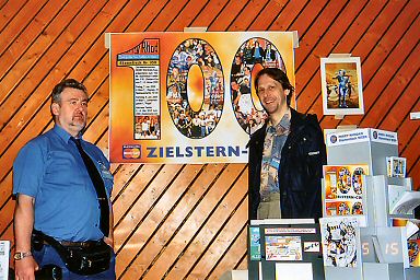 Das Rätsel war dann schnell gelöst der Aufbau konnte erst am Abend beginnen, und der große Saal würde noch durch eine Trennwand in einen Vortrags- und einen Händlerbereich geteilt werden. Mitten drin Nach und nach trudelten alle Veranstalter ein. Die Wirtsstube des angrenzenden Lokals entwickelte sich bald zur Con-Kommandozentrale und Schalt- und Versorgungsstelle der FESTAK-Leute da gab es Bühnenarbeiter, Tontechniker, Sesselschlepper, Biertrinker, eine Ehrengästebetreuerin und einige andere, die wie in einem Bienenschwarm aus- und einflogen. Wir, die Besucher, hatten es uns mittendrinnen gemütlich gemacht, so wie einige andere Gäste, die bereits am Freitag angereist waren, wie etwa Helmut Freisinger. An dieser Stelle möchte ich mich gleich für ein altes Problem von mir entschuldigen ich kann mir schlecht Gesichter merken und noch schlechter Namen, das heißt, es darf keiner beleidigt sein oder glauben, er ist weniger bekannt, wenn er in diesem Bericht nicht namentlich erwähnt wird. Keine Probleme gibt es natürlich bei den guten alten Bekannten, wie etwa beim Lokalmatador Andy Schmid, der ebenfalls seine Aufwartung machte. Und auch die meisten Ehrengäste konnte ich identifizieren, die im Laufe des Abends eintrafen, wie etwa ... na ja, die Ehrengäste halt. Während die Vorbereitungsarbeiten voranschritten, plagten wir uns beim Essen und kamen beim Einschneiden von Schweinsbraten und Knödel ganz schön ins Schwitzen. Tischlein deck dich Auch im Saal mit den Händler- und Clubtischen hatten die Aufbauarbeiten bereits begonnen. Hans-Jürgen Lachner kämpfte mit seinen Holzaufstellern, in der gegenüberliegenden Ecke begann das große Bananenkartonschlichten bei Wolfgang Kratz. Reinhard Rauscher war wie üblich etwas später dran, aber bei seiner Routine konnte eigentlich nichts schief gehen. Ganz wie gewünscht, bekam der PERRY RHODAN-Stammtisch Wien einen Tisch an der Wand zugewiesen, wo wir gleich als erstes unser riesiges ZIELSTERN-CON Plakat aufhängten, das in Folge mehr Interesse verursachte als uns eigentlich lieb war. Der Jännertermin war offenbar für viele Fans recht günstig, und auch die Gelegenheit, die österreichischen Promis und Wien kennenzulernen, hatten mehrere vor am Schopf zu packen. Was haben wir da nur angerichtet, fragten wir uns, denn eigentlich war diese Veranstaltung nur so als kleines, harmloses Treffen zum hundersten Stammtisch geplant gewesen, und nun galt es wohl, eine größere Veranstaltung auszurichten. Aber keine Angst, liebe deutsche P.R.-Freunde, euer Besuch wird sich sicher lohnen!