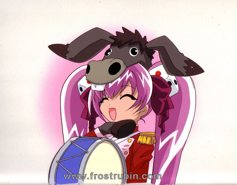 | Rabi-en-Rose hanken mono cel for a trading card game, card number 434. It is a very complete cel with matching BG (the pink colour is not airbrush, it is drawn on the BG), douga, genga and timing sheet. |