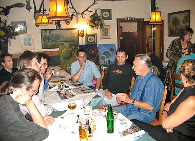 ja, eigene Schwächen erkennen, heißt die Devise. Alles lauscht dem Meister - Ernst Vlcek inmitten der Stammtisch-Runde, links vorne Michael Marcus Thurner Um ¾ 1 Uhr ging schließlich der lange Tag zu Ende, womit ich auch am Ende des Berichtes angelangt bin - und endlich die zweite Hälfte der Savannenreiter lesen kann!