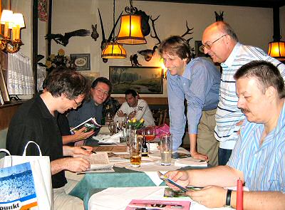 zumindest wegen des ausgefallenen Titels einen Preis bekommen. Michi Thurner musste wieder jede Menge Romane signieren und hatte auch einige Exemplare seiner Werke dabei, nebenbei wurde über das Schreiben und zukünftige Entwicklungen geplaudert. ![]() Am Ende des Abends wurde im noch verbliebenen Kreis der P.R.-Fans über den geplanten Zielstern-Con diskutiert und einige wichtige Dinge besprochen, mehr dazu findet sich im Con-Tagebuch. Dazu vielleicht noch ein paar Anmerkungen auf diese Seiten, die vorerst nur für die Wiener Veranstalter und Organisatoren gedacht sind, kann man nur mit Passwort zugreifen, d.h. jeder, der sich hier dazuzählt, kann ein solches anfordern. Dass diese eingeschränkte Zugangsberechtigung in weiser Voraussicht erfolgt ist, um eventuell brisantes Material zu schützen, das noch nicht allgemein bekannt ist, hat sich nach einem Telefonat gerade eben wieder gezeigt. Und wer jetzt nur Bahnhof versteht macht nix, wird sicher zu einem späteren Zeitpunkt aufgeklärt! *g* ![]()