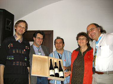 für das Buffet! Erich, Wolfgang und Karl Heinz überreichen ein Geschenk an Lisi und Charly (v.l.n.r.) |