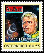 ACHTUNG: Aktuelle und weitere Infos zu dieser und allen anderen personalisierten Marken zu den Themen PERRY RHODAN und Comics finden sich auf einer neu eingerichteten Seite: Am 7. Jänner 2005 erschien in Österreich die erste offizielle PERRY RHODAN-Briefmarke der Welt mit einer Auflage von 2.500 Stück. Der aufgedruckte Nominalwert von 55 Cent entspricht dem Standardtarif für Sendungen bis 20 Gramm. Das Motiv ist eine Darstellung von Perry Rhodan