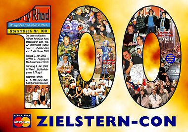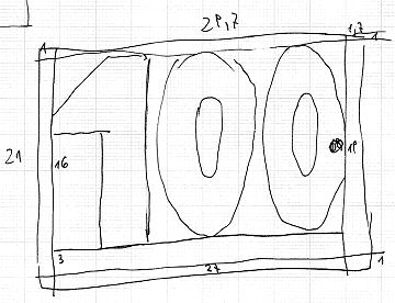Bild). ![]() Abb. 1: Zwei Entwürfe für den Zielstern-Con Flyer Der nächste Schritt war das Zusammenstellen der Bilder - welche Ereignisse und Motive waren wichtig in der Geschichte des PERRY RHODAN-Stammtisches? Und gibt es überhaupt Fotos davon? Ich mache zwar ungern Werbung für mich selbst, aber hier mußte ich nicht in die Ferne schweifen, sondern konnte einfach auf den Stammtisch- und Con-Seiten des FROSTRUBINs nachsehen, wo alles schön übersichtlich zu finden war. Die Schwerpunkte waren natürlich die beiden Austria Cons, von denen es auch massig Bildmaterial gab. (Abb. 2 - oben) ![]() Abb. 2: Zusammenstellung der Motive Der "100er" mußte so gestaltet sein, daß möglichst viel in die "hohlen" Ziffern hineinpassen würde, das heißt optimale Ausnutzung des Platzes und optimale Schriftdicke. (Abb. 3) ![]() Abb. 3: Platzaufteilung und Ränder für ein A4-Format Als nächstes gestaltete ich ein erstes Layout in Winword und machte einen Probeausdruck auf einem HP Laserjet (Abb. 4), um diese Vorlage auch in weiterer Folge zu verwenden. ![]() Abb. 4: Der erste Entwurf in Winword Dann kam der Ankündigungstext an die Reihe - alle wichtigen Infos über die Veranstaltung sollten in den 1er hineingepackt werden, da ja die Nullen für Fotos reserviert waren und sonst auf dem Blatt kein Platz dafür war. (Abb. 5) ![]() Abb. 5: Entwurf für den Ankündigungstext Weniger ist mehr, hieß die Devise, aber der Flyer war ja wirklich nur dafür gedacht, neugierig zu machen, detaillierte Infos zum Con waren damit nicht möglich (abgesehen davon, daß wir die Infos zu diesem Zeitpunkt noch gar nicht hatten). ![]() Abb. 6: Die Anordnung des Textes Oben in den 1er sollte das PERRY RHODAN-Logo kommen, wobei die