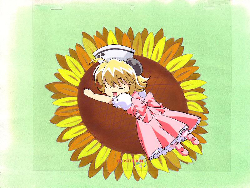 Pyoko hanken mono cel number 448 for a trading card game. Very cute cel of Pyoko lying on a sun-flower, which is drawn on the matching BG.