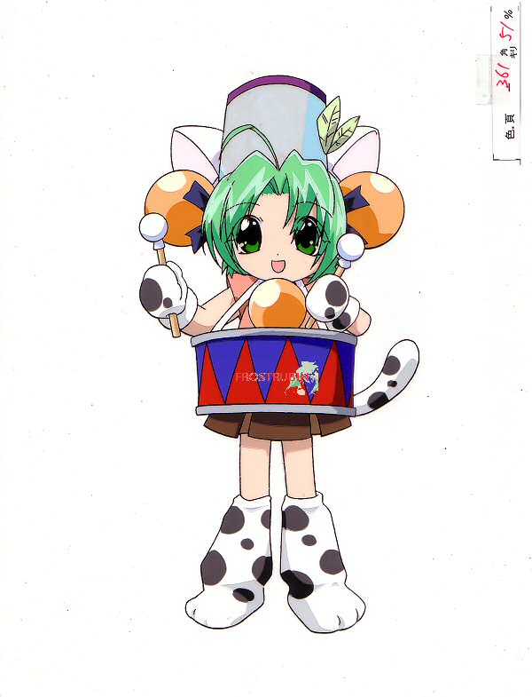 Digi-ko hanken mono cel number 361 for a trading card game. Digi-ko is drumming in cute animal outfit. In the upper right corner are the instructions for the card production.