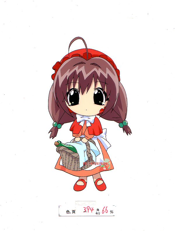 Puchiko hanken mono cel number 394 for a trading card game. A very cute picture with little Puchiko as red riding hood bringing wine and cake to her grandmother.