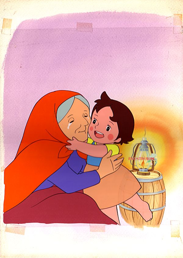 grandmother. The lines are handtraced and of very good quality. The cel is stuck to the BG, which has been drawn on a hard illustration board. It measures about 26 x 36 cm (10''x14''). |