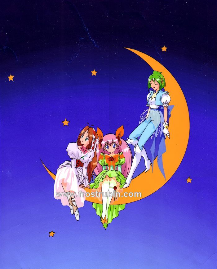 | Ein tolles und romantisches Hanken Cel mit Yuri, Momoko und Hinagiku. Das Bild findet sich auf dem Rückencover der CD "Dream Collection". Es besteht aus einem Layer und einem überdimensionalen originalen BG, der hier nicht in ganzer Größe wiedergegeben wird. Teile der Kleider sowie Momokos Mund und Nase sind ohne schwarze Outlines gezeichnet. Gesamtgröße 45x54 cm. |