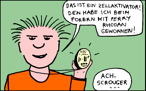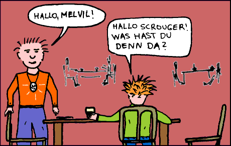 Die "Emit Tidnabs" wurden in der Nacht vom 31.10. auf den 1.11.1983 zusammen mit einigen anderen Kameraden geboren. Seit dieser Zeit treiben sie, mit oft längeren Unterbrechungen, ihr Unwesen. Sie erleben ganz normale Alltagsgeschichten, aber auch Abenteuer in Ägypten, sind auf Schatzsuche, auf der Jagd nach einer Zeitmaschine oder auf den Spuren von James Bond. Dies hier ist ihr erster öffentlicher Auftritt. Zwar haben sie schon mehrere Abenteuer im P.R.-Universum erlebt, aber diese Geschichte ist speziell für NOW! 1 ganz neu gemacht worden. Der Comic-Strip hat vier Panels und wurde direkt im PC eingefärbt. Die Story spielt zu einer Zeit, als die Zellaktivatoren noch Ei-Form hatten und nicht als Chip in die Schulter implantiert waren. Und nun Bühne frei für Melvil und Scrouger!
