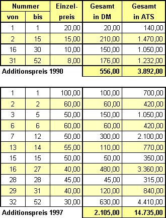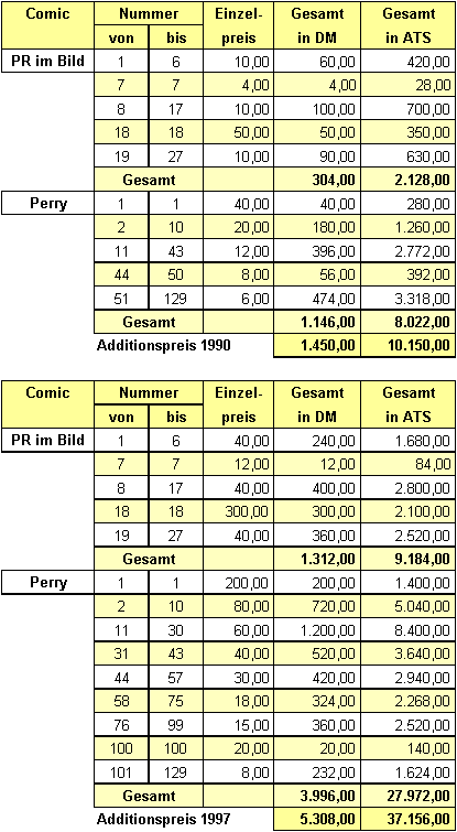 260,- ATS/37,- DM; Nr. 14: 290,- ATS/41,- DM; Nr. 19: 250,- ATS/35,- DM).