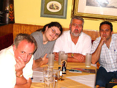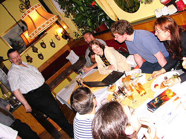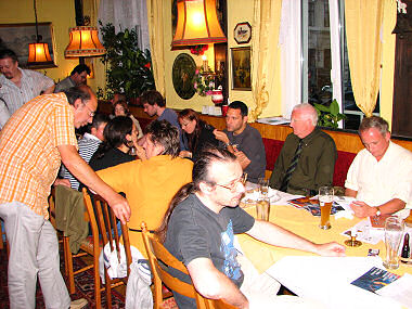 Die Stammtischrunde war wie üblich gut besucht und es trafen sich Irene, Charly und Elisabeth, Manfred, Andi, Heimo, Erich, Karl Heinz, Hermann, Thomas, Fritz, Roman, Roswitha, Christoph, Andreas, Michael Gottfried, Michi Thurner, Wolfgang, Gilbert und Sarah, und ganz spät trudelte noch Marcus ein und machte die 21 komplett. Drei weitere Gäste hatten sich entschuldigt – Niki feiert das Ende der Schufterei beim Bundesheer, während für Martin und Reinhard die Schufterei gerade erst anfing, einen abgeschmierten PC wieder zum Leben zu erwecken.