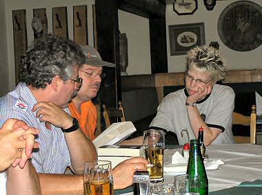 Hier der Kurzbericht von Andreas (alias Andi47, in Stammtischberichten alias Andy ;-) ) Nachdem die ersten Leute eingetroffen waren, zückte Roman Kuli und Papier, um die Namen der Anwesenden zu Papier zu bringen. Inzwischen wechselten viele Bücher den Besitzer (STAR TREK und andere), und es wurde unter anderem über den Hurrikan Katrina und das schleppende Anlaufen der Hilfe diskutiert. ![]() ![]() »Verdammt, was schreibe ich bloß?« - »Es war einmal ein P.R.-Stammtisch ...« Auch PERRY RHODAN kam natürlich zur Sprache, es wurde eifrig über die Raumschlachten im Solsystem diskutiert, die in diesem Zyklus deutlich realistischer (kein Tontaubenschießen; Spitzenroman von Eschbach) beschrieben wurden, als damals die Kämpfe gegen die Hirsche. Nachdem MMT eingetroffen war, wurde bekannt, dass PR 2304 aus seiner Tastatur stammt den Titel hatte er nicht mehr so genau im Kopf. O-Ton MMT: »Irgendwas triviales. Ich glaub »Schatten über Atlan-Village« oder so ähnlich«. Außerdem wurde bekannt, dass es im neuen Zyklus gleich zu Beginn im Solsystem »ordentlich« zur Sache gehen wird, mehr wurde aber nicht verraten. Zwischendurch kam das Gesprächsthema auf STAR WARS, die Möglichkeiten der Tricktechnik und die Umsetzung der Stunts. Später wurde u.a. noch über etwas »deftigere« Passagen in MMTs Romanen gesprochen, die in letzter Zeit etwas leichter »durchgehen« ohne dass allerdings etwas darüber verraten wurde.
