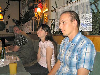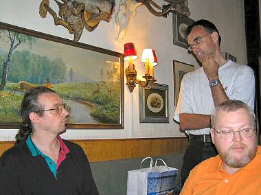 RHODAN-Stammtisch im September 2005 alles passiert ist? Mal ernsthaft: Ich seh nicht ein, warum ich meine ohnehin karge Freizeit opfern soll, um euch da draußen vor den Bildschirmen zu berichten, was Franz, Herman, Andreas L., Michael G., Geri, Leo, Andreas S., Kurt und Christine, Emanuel, Günter, Charly, K.H., MMT, Michael R., Gilbert (samt Schwester Magdalena und den beiden STAR WARS-Fans Karsten und Martin) und ich gesprochen haben. Wenn es euch wirklich interessiert, dann kriecht aus euren Höhlen, die ihr Zimmern nennt, in denen ihr euch vor der Welt verschanzt. Wendet euch von den PCs ab, die euer ganzer Stolz sind und lasst sie hinter euch zurück! Rafft euch auf, in die Neubauschenke zu kommen und über PERRY RHODAN zu diskutieren so wie es die oben genannten getan haben. Zum Beispiel gab es den Hinweis, dass es nach Band 2300 sogleich in die Vollen geht und dass die Haluter eine kleine, aber nicht zu unterschätzende Rolle spielen werden. Einige merkten an, dass die Lösung in den letzten zwei Heften einer besonderen Kraftanstrengung bedürfe, weil eben vorher nichts von Belang passiert sei, dass den Terranern zum Sieg verhelfen würde. Diejenigen mit Leserückstand (manch einer ist bei 2283, manch einer nach einem Lesemarathon schon bei 2296) hielten sich aus dieser Diskussion wohl weislich heraus, auch wenn verraten wurde, dass SPOILER die Weißlocke gestorben ist. Diese Meldung rief wiederum MMT auf den Plan, der verkündete, dass nach Myles ein weiterer Unsterblicher ins Gras beißen bzw. im All verstreut wird. Nachdem er schon im Jänner 2005 auf dem »Zielstern Con« erklärt hatte, dass er Perry töten möchte, ließ er nun mit der Tatsache aufhorchen, dass er von Atlan ebenfalls genug habe. ![]() ![]() Links Franz mit Kurt und Christine. Rechts Michael Marcus Thurner im Gespräch mit Michael R., daneben Emanuel »Atlan wird in Band 50 sterben!«, sagte er mit einer Inbrunst und einem gefährlichen als auch bestimmten Glitzern in den Augen, zu dem nur Exposéautoren fähig sind. Wer MMT persönlich kennt, weiß, dass dies kein Lippenbekenntnis ist. Meine Anmerkung, dass dieses Stilmittel durch Guckys Tod erst vor kurzem strapaziert wurde, nahm ihm jedenfalls nicht die Mordgier aus dem Gesicht. Allen Arkonidenfreunden wird auf Anfrage für etwaige Racheaktionen gerne die Adresse des Jungautors bekannt gegeben. Gesprochen wurde ebenfalls über das