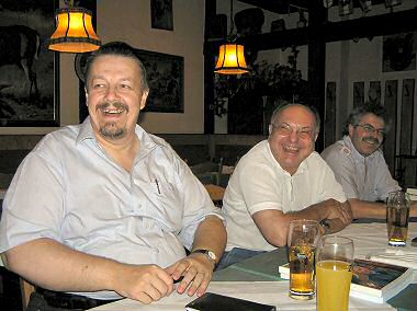bewundern ist es hier: Wer sich dieses Werk bedeutender (hüstel) Jungautoren nicht entgehen lassen will, der möge die Initiative »Fünf PERRY RHODAN-Fans auf dem Wege zum Ruhm oder auch nicht« mit dem Kauf eines Buches unterstützen. 60 Vorbestellungen liegen jedenfalls bereits vor. Und dem Hardcore Fan, der wirklich alles von seiner Lieblingsserie haben muss, sei gesagt, dass der Name Perry Rhodan einmal vorkommt. Außerdem wurde Terrania ebenfalls einmal erwähnt auch wenn die Story nichts mit der Serie zu tun hat. ![]() ![]() Karl Heinz (links) und Günther (rechts) Natürlich war auch die durch den Hurrikan verwüstete Stadt New Orleans Gesprächsstoff. Denkt man daran, dass es am zweiten Tag nach dieser Katastrophe bereits Vergewaltigungen gab, dann sieht man, wie dünn die Tünche der Zivilisation doch in Wahrheit ist. Wobei solche Kriminellen hoffentlich die Ausnahme waren. Allgemein Unverständnis herrschte über die Offiziellen, die erst drei Tage nach dem Dammbruch reagierten. Und nach einer besonderen Analyse der Situation (»Ich verstehe, dass die Zerstörungen mehr als einen Tag an Aufmerksamkeit verlangen.«) wird manch Amerikaner eine Verfassungsänderung fordern, um dem jetzigen Präsidenten eine dritte Amtszeit zu ermöglichen. Der weitere Abend war geprägt durch die Abwesenheit von Wolfgang, Erich und Martin, die auf der München Comic Börse durch die Gänge wuselten. Trotz des Fehlens dieser wichtigen Comicbesitzer entfachten Michael R., MMT und K.H. eine Diskussion über die frühen SUPERMAN-Bände. Erstaunt hörte ich, dass Superman in den Dreißiger Jahren nicht flog, sondern hüpfte. Und dass er auch nicht vor Mord zurückschreckte. MMT wurde mit neidischen Blicken bedacht, als er gestand, dass er sich die Carl Barks Collection zuzulegen gedenkt. ![]() ![]() Gute Stimmung - ein Blick in die Fan-Runde Als der Kellner uns gegen 23:45 Uhr mit gezückter Brieftasche zum Zahlen und damit zum Verlassen des Lokals aufforderte, wichen wir unter Protest der Gewalt. Allerdings setzten MMT, Michael R. und ich unsere politische Diskussion über die Wiener Wahlen und die Bundesparteiobleute vor dem Lokal bis 00:30 Uhr fort. Und wem dieser Bericht nicht genügt, um jeden ersten Freitag im Monat seinen A**** aus dem Sessel zu heben und beim Wiener PERRY RHODAN-Stammtisch vorbeizukommen, dem ist nicht mehr zu helfen!