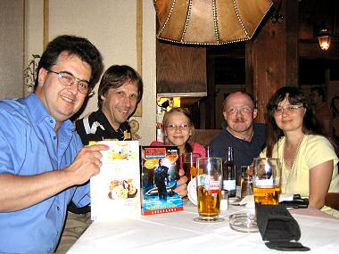 Und nun ein Bericht der Außenstelle des Wiener Stammtisches, verfasst von Erich Wir hatten nicht damit gerechnet, auf ein Comic-Fest zu fahren und dabei auf Schritt und Tritt über PERRY RHODAN zu stolpern. So gesehen war auch die Abhaltung eines externen P.R.-Stammtisches kein Problem, darüber hinaus handelte es sich sogar bei allen fünf München-Kurzurlaubern bereits um frühere, fixe Gäste des Wiener Stammtisches: Wolfgang, Martin, Claudia, Nicole und Erich. ![]() Kleiner, aber feiner Stammtisch in einem zünftigen bayrischen Gasthaus: Wolfgang, Erich, Nicole, Martin, Claudia (v.l.n.r.) Um acht Uhr früh ging es los, und wir