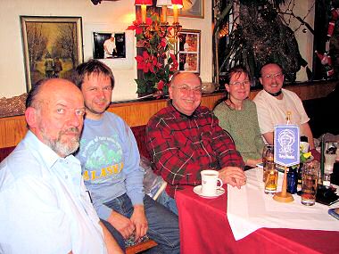 Während man noch nichtsahnend beim Stammtisch sitzt, pirschen sich bereits die Mikrobestien an! Offenbar war dieser Abend sehr kurzweilig, da die Sperrstunde völlig überraschend kam. Der Kellner wollte sich nicht ins Bett schicken lassen, und deshalb musste das letzte Grüppchen dann doch relativ kampflos das Feld räumen. Wenigstens konnte man noch einen längeren Verdauungsspaziergang machen, falls man mit dem Auto gekommen war, denn Parkplätze zur Weihnachtszeit in Mariahilf sind leider absolute Mangelware. Der nächste Stammtisch wird übrigens trotz Feiertag am 6. Jänner stattfinden, was vielleicht für die »Familienmenschen« einige kleinere Problemchen vorprogrammiert, aber hoffentlich trotzdem zu schaffen sein wird. Man sieht sich – im Neuen Jahr in alter Frische! Same time, same Perry, same station! [Anmerk. d. Red.: Dieser Bericht wurde erstmals mit dem Programm »Macromedia Dreamweaver« erstellt, deshalb bitte Formatierungs- und Anzeigeprobleme zu entschuldigen und an mich weiterzu- melden. Danke!]