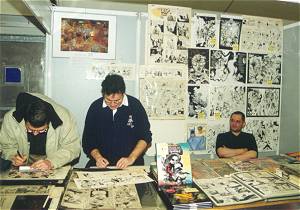 ![]() Links: Eines der großen Zelte am Place du Champ de Mars. Rechts: Moebius genießt seine Signierstunde Die bereits "klassische" Verlagsmesse fand in den beiden riesigen Zelten auf dem Place du Champ de Mars statt. Hier traf man auf so bekannte Namen wie Dargaud, Glenat, Casterman oder Les Humanoides Associès aber auch auf viele Kleinverlage, die sich hier mit ihrem Programm und insgesamt mehr als 700 Zeichnern und Szenaristen präsentierten. Auf jeden Fall war reichlich Gelegenheit sich in die Schlacht um Widmungszeichnungen zu stürzen und eine der vielen Warteschlangen zu bevölkern. Immerhin waren unter den etwa zweihundert Zeichnern so bekannte Namen wie Jean Giraud/MOEBIUS, Jean-Claud Mezieres und Pierre Christin, Philippe Druillet, Pierre Seron, Eddy Paape, Francois Walthery und Dany um nur einige zu nennen. Bei vielen mußte man sich auf längeres Warten gefaßt machen, was mit der Beliebtheit des Betroffenen einerseits und andererseits auch mit dessen Zeichengeschwindigkeit zusammenhing. Extrem war es am Stand von SOLEIL bei den Signierterminen von Didier Tarquin ("Lanfeust von Troy"). Dieser vereinte die für den wartenden Fan wohl ungünstigste Kombination an Eigenschaften - große Beliebtheit und aufwendige Zeichnungen - in sich. Hier mußte man sich auf mehrstündige Wartezeiten einstellen, die auch den ganzen Tag dauern konnten. Einige Hartgesottene hatten fast schon Notbiwaks aufgeschlagen und stellten sich schon am Morgen für die Signierstunde am Nachmittag an. Okay, Anstrengungen sind dazu da, um auf sich genommen zu werden. Schließlich war man ja nicht zum Vergnügen hier ... ![]() ![]() ![]() ![]() Francois Walthery (links oben), Jean-Claud Mezieres (rechts oben), Eddy Paape (links unten) und Pierre Seron (rechts unten) Aber nicht nur Franko-Belgier gab es, auch Amerikanische Zeichner wie etwa John McCrea (Hitman, Hulk) waren anwesend. Hier war in den letzten Jahren eine deutliche Öffnung in Richtung tatsächlicher Internationalität zu bemerken. Waren bei meinem ersten Besuch im Jahr 1995 praktisch ausschließlich Französische und Belgische Comicproduktionen vertreten und allenfalls einige Europäische Lizenzprodukte bekannter Stars wie etwa Manara, so präsentierte sich heute ein Verlag wie Marvel France bereits mit einem recht ansehnlichen Stand. Auch Merchandisingsammler und Liebhaber alter Comics kamen nicht zu kurz. Auf dem Place de New York zwischen dem Rathaus und dem Theater war ein langes Händlerzelt aufgebaut, das Espace New York. Ob man Figuren suchte, in Kisten mit antiquarischen Alben wühlen wollte oder hinter Originalen her war, hier wurde man in fast allen Fällen fündig. Von Postkarten und Schlüsselanhängern über signierte Drucke bis hin zu hochpreisigen Originalseiten, man fand alles, was das Herz des Comicfans begehrte. Sogar Originalseiten absoluter Spitzenzeichner, wie etwa eine Gaston-Seite von Franquin, wechselten den Besitzer. Auch Starzeichner Moebius hatte hier mit seinem Verlag STARDOM einen Stand. Dieser war für Eingeweihte übrigens ein Geheimtip. Im Gegensatz zum Stand von Humanoide Associes, wo nur eine einzige Signier-Session stattfand, war der Meister hier jeden Tag, manchmal sogar mehrmals, anwesend. Erkundigte man sich nach den Terminen, so bot sich meist Gelegenheit ohne große Warterei zu einer Widmungszeichnung zu kommen. Die Termine waren nämlich nicht angeschrieben, sodaß sich meist nur eine kurze Schlange bildete. ![]() ![]() Auch in Originalen und Merchandising-Artikeln konnte man nach Herzenslust wühlen Einen wesentlichen Teil des Festivals bildeten natürlich auch die rund ein Dutzend verschiedenen Ausstellungen zu allen Bereichen Rund um das Thema Comics. War im Millenniumsjahr die große Ausstellung in wirklich eindrucksvoller Weise dem Ausnahmekünstler Moebius gewidmet, so befaßte sich im heurigen Jahr die zentrale Ausstellung im Comicmuseum mit den Meistern der Europäischen Comics. Die Ausstellung war chronologisch geordnet und umfaßte laut Katalog mehr als 300 Exponate von über 70 Zeichnern aus 30 Ländern. Es begann mit Originalskizzen und Illustrationen von Wilhelm Busch und Caran D'Ache aus der Frühzeit der Comics. Unnötig zu erwähnen, daß es sich dabei um äußerst seltene Raritäten handelte, die man in dieser geballten Form nicht so bald wieder geboten bekommen wird. Was folgte war ein Streifzug durch die Comic-Geschichte. Als Sammler lief einem förmlich das Wasser im Mund zusammen. Original auf Original waren Größen wie Hergé, Jijé, Franquin, Moebius/Giraud, Forest, Druillet und viele andere vertreten, wobei das Spektrum der Ausstellung bis zu aktuellen Künstlern wie Cabanes oder Dave McKean reichte. Der deutschsprachige Raum war neben Wilhelm Busch unter anderem durch Ralf König vertreten. Zu dieser Ausstellung wurde auch ein äußerst umfangreicher Katalog angeboten, der jedem näher Interessierten uneingeschränkt empfohlen werden kann, schon alleine wegen der wunderbaren farbigen(!) Abbildungen aller(!) Ausstellungsstücke. Da die Ausstellung auch in Deutschland gezeigt werden soll, gab es sogar eine deutschsprachige Ausgabe.