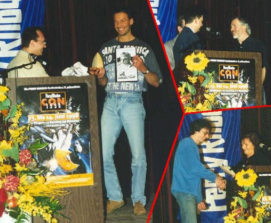 Natürlich kennt man bereits die Handlung bis zum Band 2000, und auch für "the day after" gibt es bereits Überlegungen. Daß die beiden Autoren aufgrund dieses Wissensvorsprunges bei Gesprächen mit den Fans aufpassen müssen, zeigt sich immer wieder. Ernst Vlcek erzählte dazu eine Begebenheit vom Wiener Perry Rhodan Stammtisch, wo er versehentlich ein Handlungsdetail ausplauderte, das in der Romanserie noch gar nicht erschienen war und das er schon veröffentlicht glaubte. Aber solche Dinge sind halt das Salz in der Suppe der Perry Rhodan Fans, und da mag jeder gerne gut gewürztes Essen. Hoppla, schon wieder eine gute Überleitung zum nächsten Thema gefunden! Bevor wir jedoch dazu kommen, gab es noch eine Preisverleihung: Robert Feldhoff erhielt für seinen Space Thriller "Grüße vom Sternenbiest" den SFCD-Preis für den besten deutschen SF-Roman des Jahres 1997. Der Vorsitzende des Literaturpreiskomitees, Florian Breitsameter, überreichte dem Autor nach einer kurzen Laudatio die Siegerurkunde sowie eine Trophäe in Form einer Buchstütze.