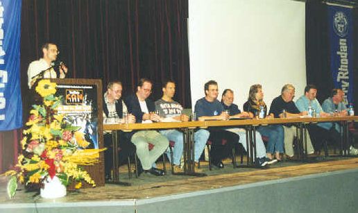 Der große Saal des Bürgerhauses war voll besetzt, und da dürften so ungefähr 500 Personen Platz haben. Wir saßen wieder auf unseren gewohnten Sitzen vom Vormittag und harrten auf dem Einzug der Gladia ... äh .. Autoren. Punkt 14:00 Uhr (und hier muß man den Organisatoren ein großes Lob aussprechen, da die Veranstaltung auch von der Pünktlichkeit der einzelnen Termine her wirklich perfekt war) wurde zur Einstimmung auf das Kommende ein Video gezeigt, das einen Zusammenschnitt von Videosequenzen aus Operation Eastside, Titelbildern, Musik von Christopher Franke und einem Fernsehbericht des letzten Garching-Cons zeigte. Dann begann der Einmarsch der Perry Rhodan Mitarbeiter, begleitet von einer kurzen Vorstellung. Am Ende war die Bühne bis auf den letzten Platz gefüllt, 20 Personen präsentierten sich im Scheinwerferlicht dem Publikum: Klaus Bollhöfener, Peter Terrid, Ernst Vlcek, Robert Feldhof, Susan Schwartz, Arndt Ellmer, Hubert Hänsel, H. G. Francis, Uwe Anton, Alfred Kelsner, Swen Papenbrock, Ralph Voltz, Gregor Sedlag, Rüdiger W. Wick, Rainer Castor, Hanns Kneifel, Achim Mehnert, Martin Schlesinger, Klaus N. Frick, Fr. Bretzinger .....