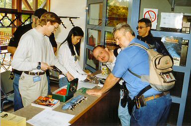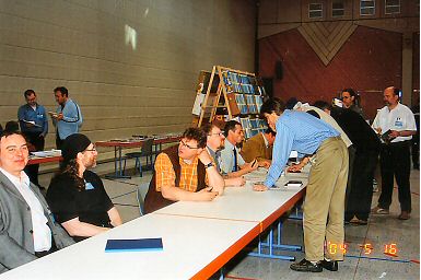 Eric Schreiber vertrat die Fanzentrale und dekorierte einen Tisch mit den obligatorischen PRFZ-Artikeln. In der Mitte des Saales präsentierte sich Hartmut Großer mit computergenerierten PERRY RHODAN-Comics, die bei den Besuchern einiges Aufsehen erregten. Zumindest mir war dieses Fanprodukt, das übrigens auch den Segen des Verlages bekommen hatte, bisher völlig unbekannt gewesen zur Zeit gibt es zwei Hardcoverbände, die die P.R.-Story von Beginn an nacherzählen, und bereits am ersten Tag war Band 1 restlos ausverkauft. Ihren Ausweis, bitte Vor dem Eingang zum Veranstaltungssaal war der Checkpoint aufgebaut. Die Besucher wurden von USO-Spezialisten empfangen, die zuerst einen Handflächenscan abnahmen und dann die codierten Besucherausweise ausfolgten. Weiters erhielt man noch ein Säckchen mit Marschverpflegung, die aus aus allerhand Werbematerial, einem P.R.-Taschenbuch, Postkarten und dem Screen Entertainment Pack bestand. Das schön aufgemachte Conbuch konnte man um 9 Euro erstehen, wer jedoch fleißig gewesen war und einen Beitrag beigesteuert hatte, bekam ein kostenloses Belegexemplar.