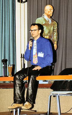 Als erster Programmpunkt stand die Signierstunde auf der Tagesordnung. Hubert Haensel samt Familie war erst heute eingetroffen und saß deshalb frisch und als Erster bei den Tischen, während sich die anderen etwas später dazuquälten. Rasch bildete sich eine kleine Schlange, und man klapperte sehr gesittet der Reihe nach die Ehrengäste ab. Die meisten waren noch anwesend und signierten Romane, Bücher und Karten. Kinder, bitte weghören! Nachdem alle Fan-Wünsche befriedigt worden waren und auch der Händler Wolfgang Kratz einen Bananenkarton voll Romanen und Taschenbüchern durch Signaturen preislich aufwerten ließ, begann der Vortrag von Hubert im Nebensaal Vom Fan zum Autor Der Autor erzählte von den Anfängen des Schreibens, seinen Probleme mit der Redaktion, seinen Arbeitsmittel und von seiner Familie, die ganz vorne im Publikum saß und sich köstlich amüsierte. Auch über die Jugendzeit wußte er einiges zu berichten, als er etwa selbst gebastelte Raketen in die Luft gesprengt hatte oder wie sein erstes angenommenes Manuskript stundenlang unausgepackt liegen blieb, weil er noch nicht ausgeschlafen war. Zum Abschluß gab er eine uralte Story aus seinen Anfangstagen des Schreibens zum Besten, der die Fans gespannt lauschten und deshalb auch keinen Abbruch durch Lt. Thaddäus Softegg wegen Überschreitung der Redezeit duldeten. This is the end, my friend Langsam, aber sicher, neigte sich für uns der Con dem Ende zu. Während im Hauptsaal ein Vortrag der Sternwarte München lief, nutzen wir die Zeit, um noch einen Rundgang durch das Veranstaltungsgebäude zu machen, die letzten Einkäufe zu erledigen und bereits die ersten Hände zum Abschied zu schütteln. Im hintersten Saal nahm Andreas Adamus bereits seine Bilder ab und verteilte die verkauften Stücke an die Fans, während die Sammelkartenspieler so wie schon seit drei Tagen noch immer an ihren Tischen zu finden waren.