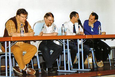 Ganz zuletzt kam sogar der Hammer unter den Hammer, der von allen Ehrengästen signiert worden war. Bei 10 Euro meinte der Auktionator noch, daß das viel zu wenig für einen so guten Hammer sei, bei 40 Euro verlor er jedoch die Fassung, daß jemand soviel für dieses Ding zu zahlen bereit sei (der Jemand war übrigens Andy Schmid) Danach gab es zum Ausspannen einen Videofilm an der Leinwand, der allerdings die Lachmuskeln gehörig strapazierte. Was zunächst als Stammtischrunde der lokalen Fans begann, wurde bald zu einem Rückblick in die 60er-Jahre zu einer Autorenkonferenz, bei der unter anderem K.H. Scheer, Clark Darlton oder Kurt Mahr anwesend waren. Die Altvorderen wurden von ihren Fans äußerst treffend und gekonnt dargestellt. Sehr köstlich Clark Darlton, der immer mit einer Gucky-Stoffpuppe (die von Iltu dargestellt wurde) spielte und K.H.Scheer, der sich seine Technik nicht madig machen ließ. H.G. Francis war leider nicht dabei, da er im Tonstudio eingesperrt worden war. Setzen, nicht genügend! Zum Abschluß des Abends mußten sich Robert Vogel, Michael Nagula, Klaus Bollhöfener und Leo Lukas der USO-Aufnahmeprüfung stellen. Es waren knifflige Fragen zu beantworten, bei denen die Prüflinge nur wenige Punkte erreichen konnten. Etwas besser schnitten sie beim anschließenden Wörter-Erraten ab, bei dem immer ein Begriff auf das Flip-Chart gezeichnet wurde und dann zu entschlüsseln war. Klaus betätigte sich dabei als Zeichenkünstler, dessen Hinweise von den anderen immer gut erkannt wurden, nur bei seinem Schlumpf taten sie sich etwas schwer. Leo ließ sich nicht abhalten, auch seinerseits den Prüfern Fragen zu stellen, sehr zum Gaudium des Publikums (Was steht auf der Wiese, frißt Heu und sieht vorne und hinten gleich gut? Eine blinde Kuh ....)