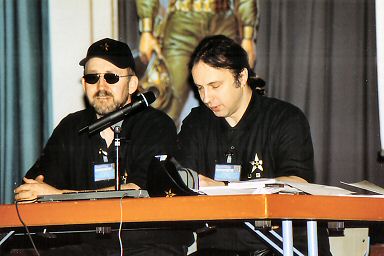 Walter Schuster aka Lt. Thaddäus Softegg machte seinem Namen alle Ehre und wurde im Laufe des Cons mehrmals degradiert und inhaftiert. Obwohl man wußte, daß diese kleinen Auflockerungs-Sketches zwischen den Programmpunkten nur eine gute schauspielerische Leistung waren, konnte einem der Kerl schon richtig leidtun. USO, USO Nach einer gut gemachten Multimedia-Show begannen die ersten Vorträge. Dieter Reich und Walter Sehrer von der FESTAK referierten zu Pro und Kontra USO, unterstützt von Bildmaterial, das auf die große Leinwand projiziert wurde. Falls ich es bisher noch nicht erwähnt habe bei diesem Con handelte es sich um einen sogenannten Themen-Con, der sich schwerpunktmäßig mit der USO, der United Stars Organisation, auseinandersetzte, und zwar sowohl mit der alten USO als auch der neuen USO. Dieser rote Faden zog sich durch die ganze Veranstaltung und war sicher eine gute und originelle Idee der Organisatoren.