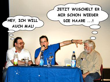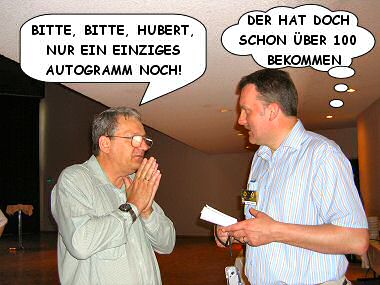 gegeben, wir wissen nur nicht, wer er war.« ![]() Danach stellen sich Klaus N. Frick und Frank Borsch den Fragen aus dem Publikum. Vorweg bittet Klaus, keine Fragen nach der aktuellen Handlung zu stellen, die habe er ja schon am Abend zuvor ausgeplaudert. Beide erzählen über ihren Beruf und wie der Verlag organisiert ist. Wer ist in der Redaktion wofür zuständig? Dabei wird auch erwähnt, dass im Jahr 2006 ein neues PERRY RHODAN-Computerspiel auf dem Markt erscheinen wird. Einen schönen Gag bringt Klaus N. Frick, indem er einen Zeitungsausschnitt hoch hält, auf dem steht: »KUH GREIFT WANDERER AN!« Dazu meinte er: »Durch die Geschwätzigkeit eines P.R.-Autors gelangte der Plot des neuen Zyklus an die Presse. Robert Feldhoff muss nun die Exposés und die ersten Bände neu schreiben. Die Superintelligenz KUH greift nun WANDERER nicht an, da könnt ihr weiter spekulieren...« Nach diesem Vortrag brach die Stunde der Autogrammjäger an! Fast alle Ehrengäste durften sich an eine lange Tischreihe setzen und fleißig Autogramme geben. Ich nutze die Chance und »verschönere« den Walter Ernsting Gedenkband von Klaus Lechelmayer um einige Unterschriften :-) Unsere Con-Bücher habe ich dummerweise im Auto vergessen. Die folgenden Programmpunkte lasse ich zu