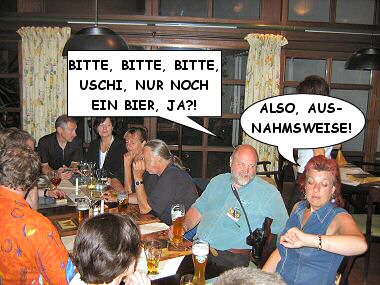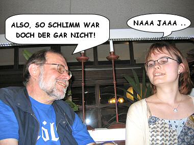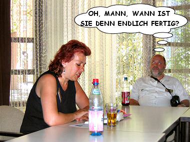 sollte? Zurück zum Hauptprogramm dieses ist mit dem Live-Rollenspiel auch beendet. Wohl stand im Programmheft noch »Gemütliches Beisammensein mit leiser Musik« als nächster Punkt an, doch für die restlichen Besucher im Saal gibt es nun kein Halten mehr: Raus in den Biergarten!!! Der Hausmeister kann diesmal ziemlich pünktlich abschließen ;-) ![]() Somit endete der Haupttag - vom Programm habe ich viel mitbekommen, dafür aber jede »Kaffeeklatschrunde« mit den Autoren ausgelassen. Nun ist aber erstmal Abendbrot angesagt. Joe Kutzner, Jürgen Müller, Gernot Semmer, Heinz Hell, Thomas Muskwitz, Dieter Reich, Oliver Trapper und ich machen uns auf den Weg zum Italiener (bei dem ich schon zu Mittag speiste). Da geht es wieder lustig her unter anderem hat der Wirt etwas Schwierigkeiten, mir ein Radler und Joe eine Weinschorle zu servieren (ich bekomme ein Helles Bier, Joe einen Rotwein), Gernot Semmer fallen zwischendurch mal wieder die Augen zu (wie so oft beim Rollenspiel auch ;-), ich verwechsle bei meiner Digicam den Akku mit der Speicherkarte (habe somit die Brüller auf meiner Seite und darf mir das nun jahrelang vom Joe Kutzner anhören ;-). Ich weiß gar nicht, was da noch alles passierte. Zwischendurch beschließen Heinz Hell und Gernot Semmer zu zahlen und ins Bett zu gehen gesagt getan. Das wäre nichts ungewöhnliches, wenn nicht Gernot etwas später fröhlich grinsend wieder auftaucht und weiter klönt (hat er da einen Doppelgänger geschickt?). Sei´s drum, gegen 00:00 Uhr beschließen Joe und ich, nun auch in die Koje zu gehen. Oli, Dieter, Thomas zog es noch ins Lokal zu den Kölnern, Jürgen Müller geht auch nach Hause. So löst sich unsere Runde auf. Im Hotel machen wir uns noch etwas frisch, lüften das Zimmer und plaudern ein bisschen. Doch die Müdigkeit macht sich schnell breit in dieser Nacht schlafen wir wesentlich besser und tiefer als zuvor (Hurra ich habe NICHT geschnarcht, bestätigt mir Joe am nächsten Morgen!). Irgendwann in dieser Nacht bekomme ich noch mit, wie Peter Scharle und Kurt Kobler nach Hause kommen ... leicht »angedüdelt« ;-) - oder habe ich das nur geträumt??? Der nächste Morgen beginnt mit einer kühlen Dusche, danach wird erstmal gepackt und zum Frühstück gegangen. Nachdem wir uns ordentlich gestärkt haben, bezahlte ich das Zimmer, während Joe schon mal das Auto vorfährt. Danach geht es wieder zum Con. Der Sonntag läuft ja traditionell träge an zwar sind schon einige Leute da, aber man sieht in jedem Gesicht die Müdigkeit der vergangenen Nacht. In diesen Morgenstunden ist es schon wieder sehr heiß sollte man gar nicht glauben. Ich schaue bei den Händlern vorbei, werde aber nicht recht fündig. Daher nutze ich die Zeit für das eine oder andere Gespräch. Zum Beispiel unterhalte ich mich etwas länger mit Marianne Sydow. An ihren Stand verkauft sie auch Belegexemplare ihrer Romane die sind in einem sehr guten Zustand, dazu gibt es ein Autogramm der Autorin, was will fan mehr. Der Preis ist sehr günstig. Als ich ihr den Roman mit Alaska Saedleare hinlege, wird ihr Blick traurig. Sie erzählt mir: »Den wollte Willi damals selbst schreiben. Als ich das Exposé von ihm zugeschickt bekam, wusste ich, dass es schlimm um ihn stand! « Den ersten Programmpunkt, den ich an diesem