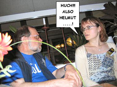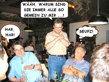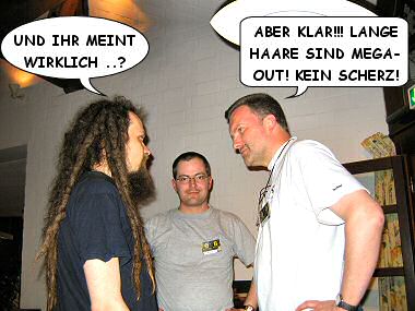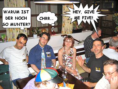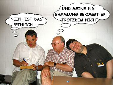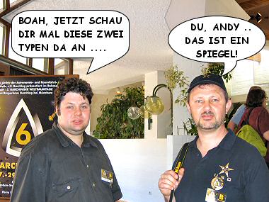In der Hitze der Garching-Nacht[Anmerkung der Redaktion: Zunächst möchte ich mich einmal ganz herzlich bei Andy Schmid für diesen prompten, sehr erfrischend geschriebenen und ausführlichen Bericht über den PERRY RHODAN-Con in Garching bedanken. So habe ich nicht nur die Möglichkeit, den werten Lesern des FROSTRUBINs sehr rasch Eindrücke zu diesem P.R.-Ereignis des Jahres zu servieren, sondern kann auch meinen eigenen Bericht früher abliefern, weil ich mich nur mehr auf ergänzende Highlights und eine kurze Beleuchtung des österreichischen Fandoms am Con beschränken werde. Die Fotos wurden freundlicherweise von Martin Steiner zur Verfügung gestellt. Da er mehrere hundert Fotos geschossen hat und die Auswahl der besten Bilder für ein Online-Fotoalbum noch etwas dauern wird, habe ich den Bericht mit Fotos aufgelockert, die gleich beim ersten Aussieben durchgefallen sind und die normalerweise nie jemand zu Gesicht bekommen hätte, allerdings ergänzt mit (hoffentlich) witzigen Kommentaren. Ich hoffe, jeder der darauf Abgebildeten versteht Spaß und falls nicht, dann bitte um ein kurzes Mail und ich entferne das Bild.]