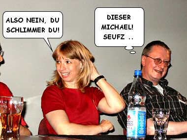 Martin Steiner, wenn man sie braucht ;-) Beim Umbau zum nächsten Programmpunkt sehe ich plötzlich Reinhard Habeck, zusammen mit Walter Ernstings Tochter Sonja. Ich bitte beide um ein Foto Sonja gibt Reinhard ein Bussi und ich knipse das ein tolles Foto. Natürlich wollen beide einen Abzug und jetzt erst erkennt mich Reinhard Habeck (für Uneingeweihte, wir haben zwar schon mehrere Jahre Brief- und Emailkontakt, aber persönlich begegnet sind wir uns bisher noch nicht ;-) ![]() Im Programm geht es nach einer kurzen Umbauphase auf der Bühne mit den »Geschichten aus dem Old-Rocket Man« weiter. Dabei handelt es sich um ein Live-Hörspiel, vorgetragen von Birgit Fischer, Robert Vogel, Hermann Ritter und dem Gaststar Hubert Haensel. Die Geschichte dreht sich um ein Lokal (das Old Rocket Man) auf einem Kolonieplaneten des Solaren Imperiums, welches vom Inhaber (Robert Vogel) und seiner Teilhaberin (Birgit Fischer) betrieben wird. Mitten in die Vorbereitungen zum Staatsbesuch von Reginald Bull platzt ein Raumpilot (Hermann Ritter), der anscheinend aus der Vergangenheit kommt. Durch eine Raum-Zeit-Anomalie wurde er in die Gegenwart versetzt, wodurch in der Vergangenheit Reginald Bull ums Leben kam. Der Pilot möchte das ändern, fliegt zurück und nimmt als Beweis eine Münze mit. In der Gegenwart erscheint dann Reginald Bull (Hubert Haensel) und erzählt die Geschichte seiner abenteuerlichen Rettung vor 50 Jahren durch einen jungen Piloten und übergibt dem Lokalbesitzer eine zerdellte Münze....... Das Live-Rollenspiel ist sicherlich eine innovative Idee der Veranstalter. Leider spielt zuweilen die Technik einen Streich (vor allem die arme Birgit Fischer ist davon betroffen). Insgesamt zieht sich das Spiel etwas hin, unterbrochen von kleinen Trailern zu »Stargate«, »Nydenion« und dem ATLAN-Fanfilm. Hubert Haensel als Bully mit gefärbten Haaren ist recht witzig, die Story ist mir schon von irgendwo her bekannt auf jeden Fall ist sie leicht durchschaubar. Einige nette Zitate aus anderen SF-Serien lockern das ganze auf (z.B. »Stargate«, »Per Anhalter durch die Galaxis« oder »Darkover«). Aber natürlich ist der Programmpunkt nicht so ein Brüller wie der Auftritt von Leo Lukas im Jahr zuvor. Während des Spiels verlassen immer wieder Zuschauer den Saal das finde ich den Protagonisten auf der Bühne gegenüber etwas unfair. Alle Vier bemühen sich redlich so etwas auf der Bühne zu spielen ist nicht leicht, das weiß ich aus eigener Erfahrung! Also, Hut ab vor Birgit, Robert, Hermann und Hubert! Eine kleine Anmerkung noch zu den Trailern