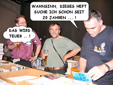 Alle zwei Jahre verwandelt sich das Bürgerhaus des kleinen Ortes Garching (bei München) in ein Tollhaus! Seit den neunziger Jahren des vergangenen Jahrhunderts finden hier die Garchinger Weltraumtage statt. Was mit einer beschaulichen Philatelieausstellung begann, entwickelte sich seit 1996 im 2-Jahres-Rhythmus zu einem Mekka der PERRY RHODAN-Fans. Der Con in Garching hat Tradition und für jeden Fan ist es fast schon Pflicht, dort zu erscheinen. Joe Kutzner vom TCE trifft am Freitag gegen 13:30 Uhr bei mir zu Hause ein. Nachdem Joe sich etwas ausgeruht und einige Teile meiner umfangreichen PERRY RHODAN-Sammlung in Augenschein genommen hat, beschließen wir gegen 14:30 Uhr, nach Garching weiterzufahren. Schnell noch bei Nachbar Heinz Hell vorbei geschaut, die Ernsting-Gedenkbände eingepackt - los gehts Ich grüble, wofür die Abkürzung »OK« auf Joes Nummernschild steht, dann kommt mir die Erleuchtung na klar: »Old Kutzner« ;-) Nach knapp eineinhalb Stunden kommen wir am Veranstaltungsort an. Die Sonne brennt gnadenlos vom Himmel, entsprechend trocken sind unsere Kehlen. Nachdem wir im Gasthof Neuwirt eingecheckt haben, bringen wir unser Gepäck auf das Zimmer und gönnen uns im Biergarten des Hauses erstmal ein kühles Radler. Joe präsentiert mir gleich das neue PARADISE, die Haus- und Hofzeitschrift des TCE. Trotz der angenehmen Kühle im Biergarten entschließen wir uns, das Bürgerhaus aufzusuchen schließlich wollen wir heute noch den Clubtisch des TCE aufbauen. Das Angenehme am Gasthof Neuwirt ist die zentrale Lage zum Congebäude (gerade mal 100 Meter zu Fuß). Die U-Bahnbaustelle vor dem Gasthof zwingt uns zwar zu einem kleinen Umweg, aber das sind auch nur ein paar Meter mehr. Sonst konnte man direkt durch die Einkaufspassage zum Congebäude schlendern. ![]() Im Bürgerhaus selbst herrscht bei unserer Ankunft schon ein hektisches Treiben. Sofort trifft man auf alte Bekannte. Das Orga-Team rund um Stefan Friedrich und Michael Rauter werkelt und schwitzt, es bleibt bei einigen hektisch gemurmelten Begrüßungen. Nur Dieter Wengenmayr ist der ruhende Pool. Die Club- und Händlertische werden bereits fleißig aufgebaut, das Congebäude selbst ist schon dekorativ geschmückt. Auch Uschi Zietsch P.R.-Fans bestens bekannt als Susan Schwartz ist mit ihrem Gatten Gerald anwesend und präsentiert ihren Fabylon-Verlag. Auch sonst sieht man schon einige »Promis« umherlaufen: Uwe Anton, Michael Marcus Thurner, Sabine Kropp, Klaus N. Frick, Inge Mahn und Arndt Ellmer mit Familie, um nur einige zu nennen. Zwei Delegationen aus Frankreich präsentieren ihre Clubtische, Dieter Reich und Gernot Semmer bauen den Stand der ARGE FESTAK auf, andere Tische bleiben noch leer. Eine besonders schöne Überraschung ist die Anwesenheit von Marianne Sydow (mit einem eigenen Stand), ihr Engagement in der Fanszene ist selten geworden. Die Händler sind ziemlich die selben, wie vor zwei Jahren (Wolfgang Kratz, Reinhard Rauscher, Klaus Hoess, Jürgen Lachner, usw.), neu dabei ist der Verlag Dorifer mit dem PERRY RHODAN-Rollenspiel. Der sympathische Dr. Rainer Nagel betreut diesen Stand und stellt sich gerne den Fragen der Fans. Auch das Team von »Beetwen the Stars« mit Lothar Rämer ist anwesend. Auch das Lokal des Bürgerhauses freut sich, weil die sommerlichen Temperaturen laden zum Weißbier im Gastgarten vor der Bürgerstube ein viele der anwesenden Fans und Autoren lassen es sich dort bereits gut gehen! Ich treffe gleich auf zwei liebe alte Bekannte: Erich Loydl (mit Familie) und Martin Steiner vom Stammtisch Wien. Beide haben für mich einiges mitgebracht. Martin hat noch Fotos vom letzen Frankencon dabei, Erich einige Devotionalien vom Zielsterncon in Wien. Flugs ist mein Geldbeutel um einige Euro leichter ;-) Tja, unsere Nachbarn aus Österreich haben nicht nur Charme zu bieten, sondern auch tolle Ideen rund ums PERRY RHODAN-Merchandising. Die erste gültige P.R.-Briefmarke der Welt kann sich genauso sehen lassen, wie die Risszeichnungsbox von Martin Steiner oder die Leinenmappe von Michael Wittmann mit »20 Ansichten aus dem PERRY RHODAN-Universum«! Ich kann jedem P.R.-Fan nur empfehlen, sich mal auf der Homepage der Wiener (www.frostrubin.com) umzusehen es gibt noch einiges zum Bestellen ;-) Soviel Schleichwerbung sei mir hier erlaubt! Zwischendurch checke ich schon mal an der Kasse ein und hole mein Con-Paket ab. Neben einem Button, dem Namenskärtchen, einem Programmheft und einer Postkarte mit dem Con-Motiv, gibt es das übliche Fanpaketeinerlei, gesponsert von VPM: Feuerzeug, Kugelschreiber, Heftroman, das Fanstorys-Taschenbuch »Begegnung an de großen Leere«, Prospekte, ein Postkarten-Set, usw. Das Con-Buch ist nicht dabei, das gibt es erst am nächsten Tag zum Kaufen (allerdings freue ich mich, dass ich mehrere Beiträge in Form einer Geschichte und einiger Zeichnungen geleistet habe somit steht mir ein kostenloses Belegexemplar zu ;-). ![]() Um 19:00 Uhr steht schon der erste Programmpunkt an: Redaktion trifft Fandom. VPM hat zu diesem Treffen in Zusammenarbeit mit den Con-Organisatoren und der P.R.-Fanzentrale eingeladen. Diese Einladung wird immerhin von knapp 20 Personen angenommen. Vertreter der Clubs ARGE FESTAK, TCE, PROC, PRBCBS, ACD und SFC Universum, der Stammtische München, Köln, Nürnberg, Mannheim und Wien, Organisatoren des Colonia-Cons, des Garching-Cons und des Franken-Cons sowie einige »Einzelkämpfer« repräsentieren einen guten Durchschnitt des PERRY RHODAN-Fandoms. Hermann Ritter von der PRFZ, Miriam Hofheinz, Klaus N. Frick und Klaus Bollhöfener vertreten den kommerziellen Teil der PERRY RHODAN-Serie und des Verlages. Zentrales Thema der Veranstaltung ist der mangelnde Zuwachs junger Menschen im Fandom. Die Fanszene altert mit der Serie, der Durchschnitt der heutigen Con-Besucher liegt zwischen Mitte 30 und 50 Jahren. Wie kommt man an eine Jugend heran, die durch die Multimediagesellschaft verwöhnt ist? Was muss ein Con bieten, damit ihn junge Leute inte