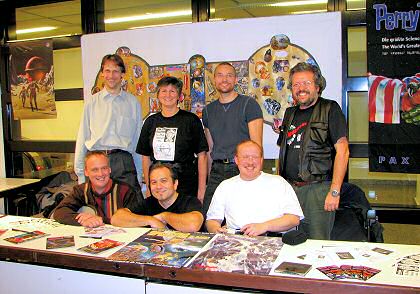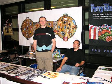 FREITAG, 24. November 2006Heute machte Irene den Anfang. Sie hatte sich extra einen Urlaubstag für die Standbetreuung genommen und war auch die Erste im Austria Center. Aber wo war Thomas? Wie kommt man ins Gebäude, wo ist der Stand, was ist zu tun? Nun, selbst ist die Frau, und so konnte Irene den Stand trotzdem zeitgerecht »in Betrieb« nehmen. Ausgestattet mit einem eigenen PR-Stammtisch T-Shirt hielt sie zunächst mal alleine die Stellung. Und dann um 9:00 Uhr kam der Angriff der »kleinen Monster« – Schulklassen und Kindergärten hatten am ersten Tag freien Eintritt, und das äußerste sich in Horden von Kindern, die die Veranstaltung unsicher machten. Besonders gut gingen natürlich die Aufkleber weg, die Feuerzeuge wurden sicherheitshalber ganz nach hinten geräumt. Zwar war am Vortag eine behördliche Kommissionsgruppe durch die Räumlichkeiten marschiert und hatte von allen Plakaten und Transparenten ein Stück abgeschnitten, um damit eine »Feuerprobe« zu machen – die PERRY RHODAN-Flagge wurde zum Glück nicht geprüft, die ist nämlich zu 100% aus Polyester – aber man wollte das Schicksal ja nicht herausfordern. Für die Prospekte und Romanhefte waren die Kinder natürlich nicht die geeignete Zielgruppe – Was ist das? – PERRY RHODAN. Willst du ein Heft haben? – Nein, ich kann noch nicht lesen! –, aber einige nahmen vielleicht für ihre Eltern etwas mit. Mittlerweile waren auch Roswitha und Thomas dazu gestoßen, und so konnte sich immer jemand auch auf der restlichen Veranstaltung etwas umsehen. Dazwischen gab es immer wieder Schaukämpfe von finsteren Barbaren, die mit riesigen Plastikschwertern aufeinander einschlugen und um die Gunst von zwei edlen Burgfräuleins vom Stand nebenan kämpften. An unserem Stand gab es Kämpfe ganz anderer Art – Roswitha hatte Mehlspeisen mitgebracht, und die fanden bei den Kindern naturgemäß mehr Anklang als die trockenen Informationsbroschüren. Aber es verirrten sich auch etliche Erwachsene an diesem Tag an den Stand, auch wenn einige von ihnen erst überzeugt werden mussten, dass die Rhodan-Serie nach wie vor läuft – Die Hefte gibt’s eh nicht mehr, das weiß ich ganz genau! Andere wussten natürlich sehr wohl, dass Perry immer noch durch das Weltall düst, so wie der Großvater, der seinem Enkel erzählte, dass er noch viele zweistellige Heftnummern daheim habe. Und die Großmutter wollte sogar wissen, ob es denn den Gucky auch noch gäbe … Am frühen Nachmittag verstärkten dann Erich und Karl Heinz das Team, während sich Roswitha verabschiedete. Kurz darauf traf auch Martin ein, und dermaßen gestärkt, konnte man sich wieder ein bisschen im Gebäude umschauen. Nicht weit daneben hatte das PERRY RHODAN-Sammelkartenspiel seinen Stand aufgebaut und war mit zwei Mannen und reichlich Material bestückt. Der Chef Lothar Rämer würde erst morgen einfliegen, um die kleinen bunten Kärtchen zu präsentieren. Es fanden bereits erste Einführungsrunden statt und es gab Diskussionen über die neuen Promokarten, die für Nur-Sammler nur sehr schwer und zu immensen Preisen zu bekommen sind. Allzu durstig durfte man nicht sein, denn die Preise – ein Cola kostete zum Beispiel 3,30 Euro – waren schon sehr hoch, und bei der Zuckerwatte und dem Popcorn sahen wir uns vorsichtshalber lieber gar nicht die Preise an. Schließlich hatten wir keine Großeltern dabei, die für das Wohl ihrer Kleinen sorgten. Aber man kommt ja schließlich nicht zum Essen und zum Trinken hierher, sondern – zum Spielen, und das konnte man reichlich. Einen Stock über uns gab einen riesigen Saal mit einer unüberschaubaren Anzahl von Tischen, an denen man viele verschiedene Spiele ausprobieren konnte. Am späteren Nachmittag wurde es etwas ruhiger, aber wir nutzen die Zeit, um mit den PR-Kollegen »von schräg gegenüber« – Michael Gottfried und Franz Miklis – zu plaudern und ihre Bilder zu bewundern. Franz hatte unter anderem auch noch einige seiner »100 Maschinenträume« dabei, die er am Kein Con vor einem Monat erstmalig präsentiert hatte. außerdem fand sich jemand, der ein schönes Gruppenfoto machte!