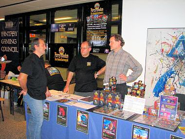 Im Laufe des Tages stießen noch einige der Stammtisch-Crew dazu, wie etwa Wolfgang und Erich mit ihren Familien, Martin Steiner und Michi Rossmann mit Claudia. So konnte wieder die Zeit genutzt werden, sich ein bisschen im riesigen Gelände des Austria Centers umzusehen. Viele nutzten die Möglichkeit, sich Spiele auszuborgen und sofort Probe zu spielen. Nicht nur der große Saal, sondern auch die Gänge und sonstige freie Flächen waren mit Spielwütigen besetzt. Es war schön, zu sehen, dass auch Brettspiele nach wie vor ihre Anhänger haben, auch wenn die Playstation- und XBox-Terminals geradezu magische Anziehungspunkte vor allem für die jüngeren Besucher waren. Es verirrten sich wieder erstaunlich viele an unseren Stand, die bereits in der Vergangenheit Bekanntschaft mit Perry Rhodan gemacht hatten. »Ja, die Hefte habe ich früher einmal gelesen«, waren typische Aussagen von männlichen Besuchern mittleren Alters. Es gab auch welche, die eine PR-Sammlung abzugeben hatten oder aber für Bekannte und Freunde ein Feuerzeug oder einen Kugelschreiber mitnahmen. Immer wieder war jedoch ein gewisses Glitzern in den Augen zu sehen, wenn sich Besucher an alte Zeiten erinnerten: »Während der Schulzeit habe ich immer PERRY RHODAN gelesen. Aber dann war die Schule aus und das Leben hat begonnen – und dann war es auch mit Rhodan aus .,..« Vielleicht war ja das nachfolgende Gespräch ein kleiner Anstoß, Rhodan wieder beginnen zu lassen!